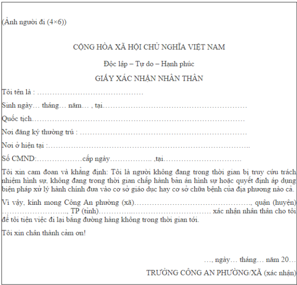 Ngoài ra, trường hợp hành khách bị mất giấy chứng minh nhân dân (CMND) nhưng không có các giấy tờ thay thế khác để sử dụng để đi máy bay thì buộc phải làm GIẤY CHỨNG NHẬN NHÂN THÂN hay còn gọi là GIẤY XÁC NHẬN NHÂN THÂN do công an phường nơi hành khách cư trú xác nhận. Trên giấy xác nhận nhân thân phải có hình (chụp theo kiểu của CMND), còn thời hạn và có dấu giáp lai của Công an phường.